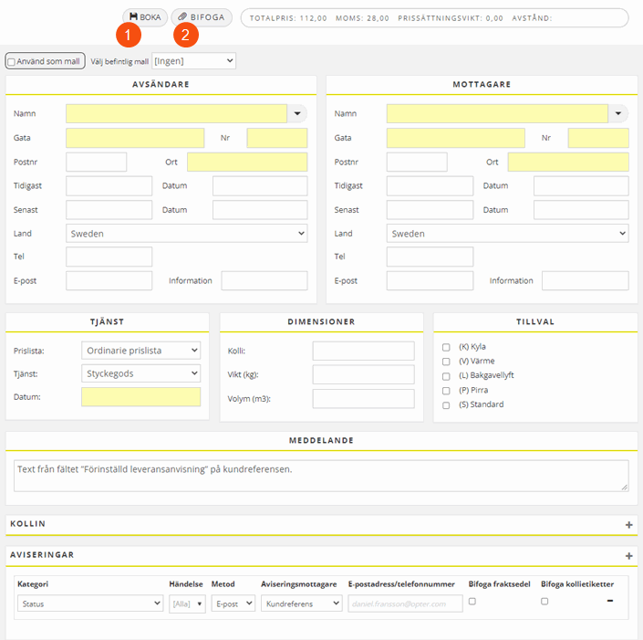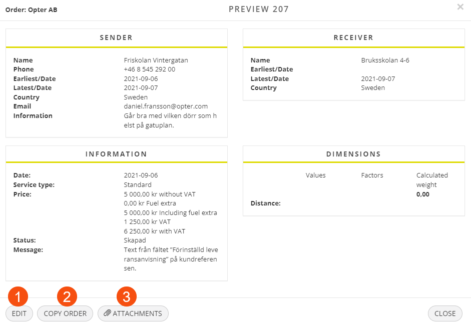 The order page can be used to order transport services. Fill in the form and click on Salvesta at the top (1). Fields highlighted in yellow must be completed in order to book the order. Clicking on Salvesta will open a preview in which the order can be checked. If everything is correct, click on Salvesta again to save the order. To change anything, click on Sulge to go back to the order form.