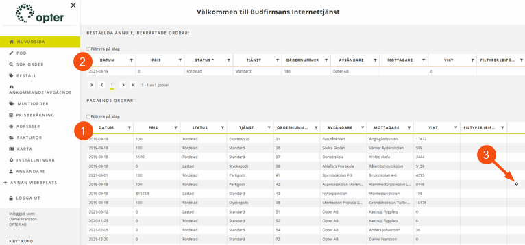 The main page shows an overview of current orders (1) and any orders that have been placed but not yet confirmed by the dispatcher (2). The columns to be displayed in the lists are defined by the system administrator. Click on an order to display details about the order (detail view). Click on the map pin to go to the map (3).