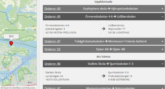 Next to the map, loaded and allocated orders are listed. The order number, sender’s and receiver’s names are displayed for each order. If you click on the plus sign on the far right, the sender and recipient addresses will also be displayed. To see more information about an order, click on the order number in the list to open the detail view.