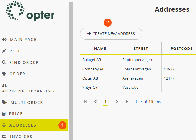 On the customer web, click on Aadressid (1) in the menu on the left.