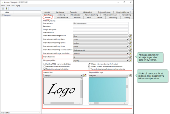 These instructions show how to customise the appearance of the customer web for all customers, on the Internet tab in the office settings. The appearance of the customer web can also be adapted for individual customers on the Internet tab in the customer registry. If the setting for Interneti stiililehed in the customer registry is [Vaikimisi], the office settings are used.