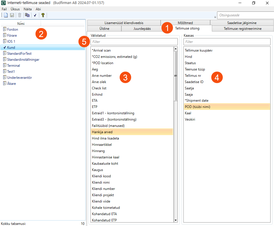 The Välistatud list (3) contains the columns that can be displayed. The Kaasas list (4) contains the columns that are currently being displayed. Double-click on a column to move it to the other list.
