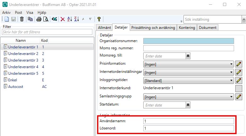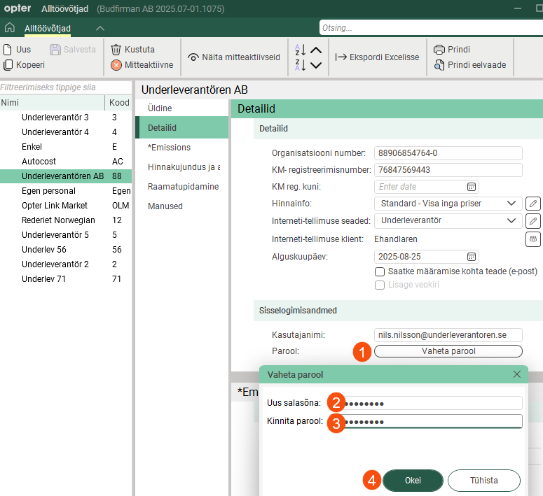 Click Register > Alltöövõtjad and select a subcontractor from the list on the left. Go to the Detailid tab.