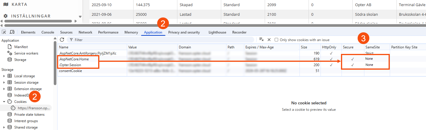 Check that the .AspNetCore.Home and .Opter.Session cookie files have a tick in the Secure column and that there is None in the SameSite column.