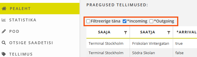 Click on the box next to the text to filter the list. Click again when you want to remove the filter. For example, if you are already filtering on Incoming (as in the image above), and then choose to filter on Outgoing, the filter Incoming will be automatically removed (otherwise nothing would appear in the list). You can combine the filter Incoming with the filter Filtreerige täna if you wish. You can also combine the filter Outgoing with the filter Filtreerige täna.