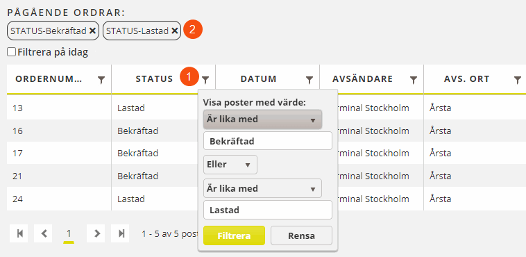 in the column headings (1). Multiple columns can be included in the filtering at the same time. After performing filtering, the filters can be removed one by one until the list shows all the shipments again (2).