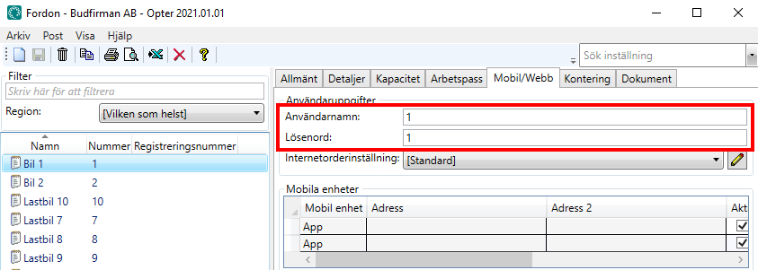 Click on Register > Transpordivahendid, select a vehicle in the list on the left and go to the Mobiil/veeb tab.