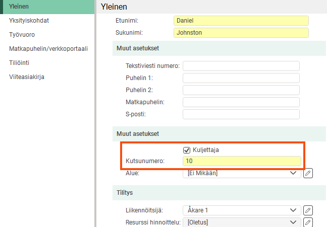 Valitse työntekijä vasemmalla olevasta luettelosta ja valitse sitten Kuljettaja välilehdeltä Yleinen. Sinun on myös syötettävä kuljettajan kutsunumero. Jos kuljettajaa ei löydy työntekijöistä, lisää hänet napsauttamalla Uusi.