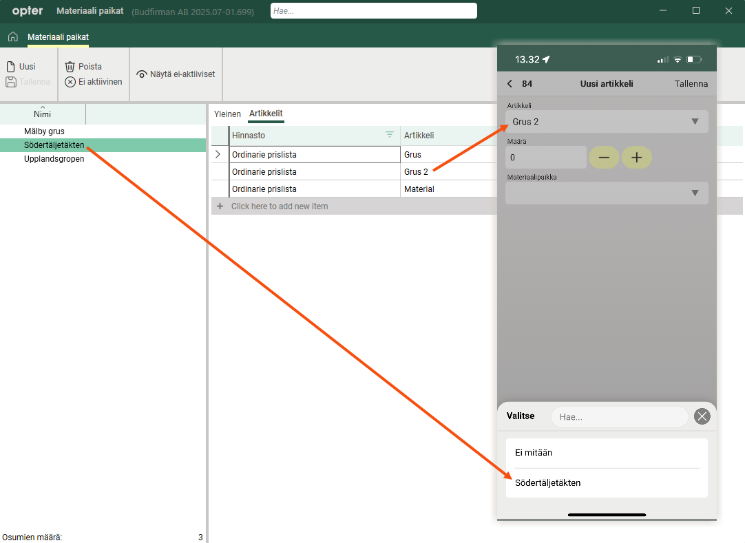 Alla olevassa esimerkissä artikkeli Sora 2 on linkitetty vain yhteen materiaaliainelaan, Södertäljen patoon. Siksi sovelluksessa näytetään vain nämä materiaalipaikat, kun kuljettaja on valinnut sora 2 Artikkeli.