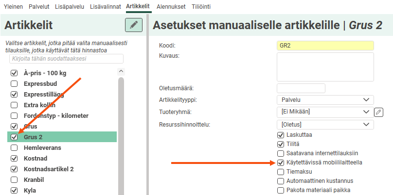Siirry välilehdelle Hallinto > Hinnastot > Hinnastot > Artikkelit. Varmista, että Artikkeli, jotka haluat linkittää materiaalipaikkoihin, on rastitettu luettelossa ja että Käytettävissä mobiililaitteella on valittuna.