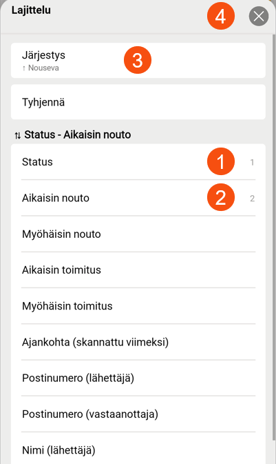 Kuljetukset lajitellaan numerojärjestykseen lähettäjän postinumeron mukaan. ↑ Nouseva = 0–9. ↓ Laskeva = 9–0. |