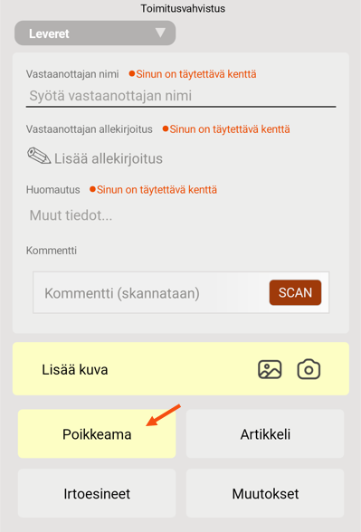 Poikkeama rekisteröidään POD-näkymässä, eikä toimitusvahvistusta voi tallentaa ennen kuin poikkeama on rekisteröity.