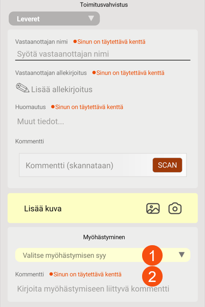 Opter Driver for iOS:ssä ja Opter Driver Labs for Androidissa syy syötetään POD-näkymässä, jossa kuljettaja valitsee viivästyksen syyn (1) ja kirjoittaa kommentin (2). Toimitusvahvistusta ei voi tallentaa ennen kuin syy ja huomautus on täytetty.