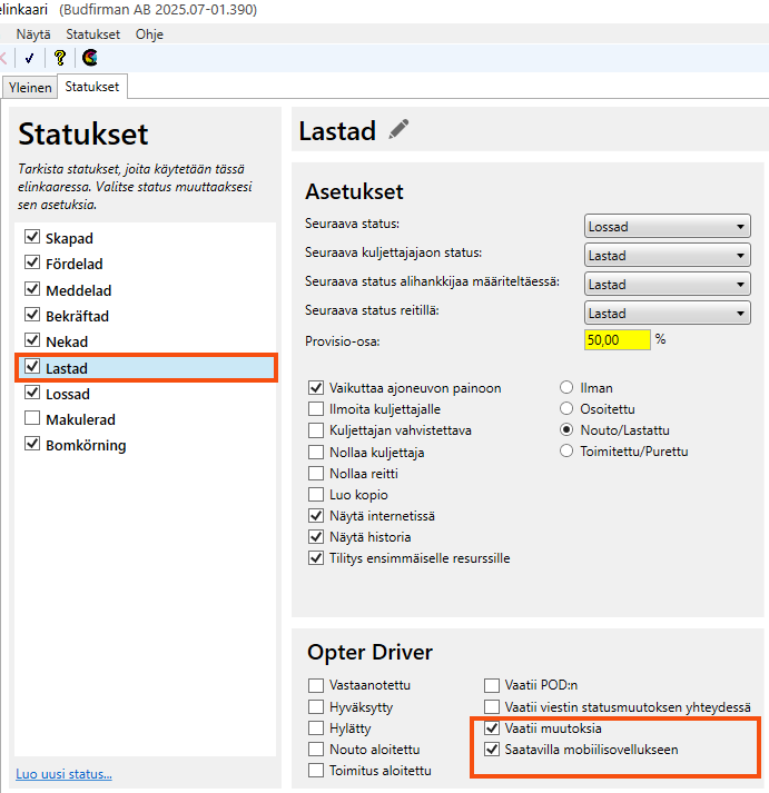 Jos esimerkiksi haluat, että kuljettajien on pakko rekisteröidä vähintään yksi muutos, kun he muuttavat kuljetuksen tilan muotoon Lastattu, merkitse rasti valintaruutuihin Vaatii muutoksia ja Saatavilla mobiilisovellukseen tilan Lastattu kohdalla.