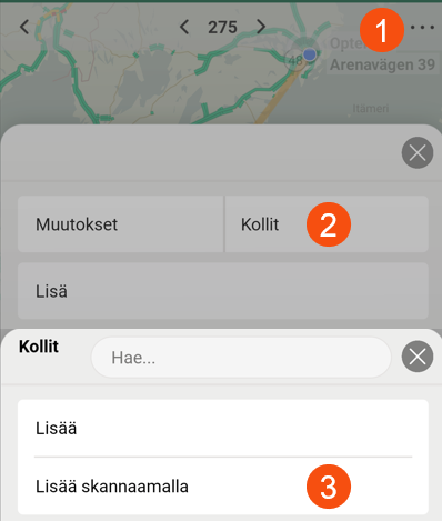 Oletusarvoisesti kuljettajat eivät voi lisätä paketteja tilauksiin skannaamalla niitä, mutta voit asettaa sovelluksen niin, että kuljettajat voivat tehdä niin. Valikkokohta Lisää kolli skannaamalla ilmestyy sitten yksityiskohtaiseen näkymään sen jälkeen, kun kuljettaja on painanut Kollit.