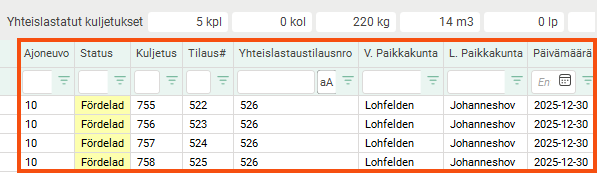 Alla olevassa kuvassa on esitetty, miltä ajojärjestelyissä voisi näyttää, kun olemme lisänneet sarakkeen Yhteislastaustilausnro.