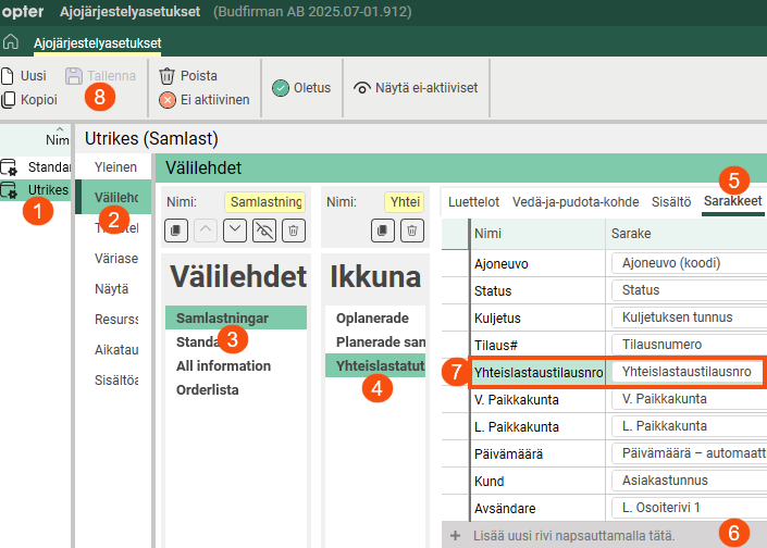 Valitse Sarake -sarakkeesta Yhteislastaustilausnro. (Tässä Opterin nimi näkyy sarakkeessa).
