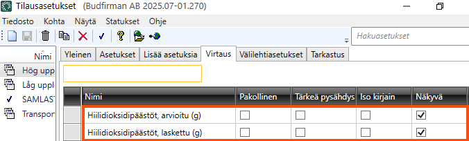 Jos haluat näyttää kentät Arvioidut hiilidioksidipäästöt (g) ja/tai Lasketut hiilidioksidipäästöt (g) Tilausten vastaanotossa, toimi seuraavasti: