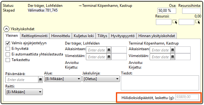 Kentän Lasketut hiilidioksidipäästöt (g) arvoa ei voi muuttaa, koska se on yhteenlaskettu arvo. Opter-versiosta 2024.12.00 alkaen on mahdollista muuttaa yhden tai useamman tilaukseen sisältyvän kuljetuksen laskettuja hiilidioksidipäästöjä niin, että myös tilauksen lasketut hiilidioksidipäästöt päivittyvät.