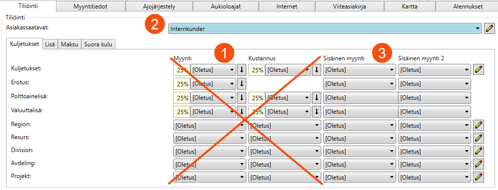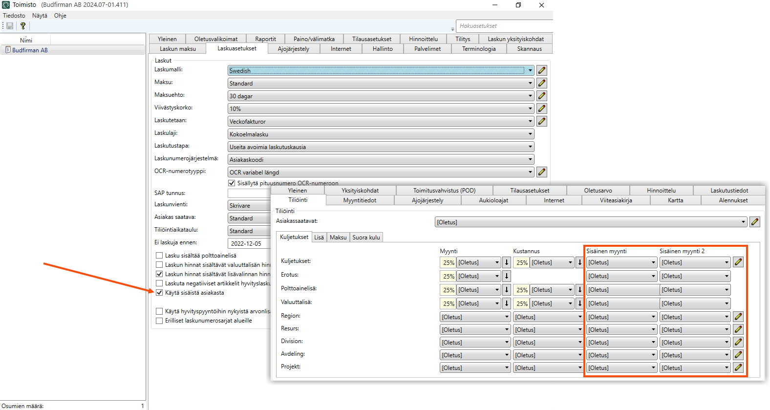 Jos poistat asetuksen valinnan, sisäinen laskutus otetaan pois käytöstä ja käytetään tavanomaista tiliöintiä. Jos olet määrittänyt erityisiä tiliöintiasetuksia esimerkiksi asiakasrekisterissä, järjestelmä muistaa ne, jos otat toiminnon uudelleen käyttöön.
