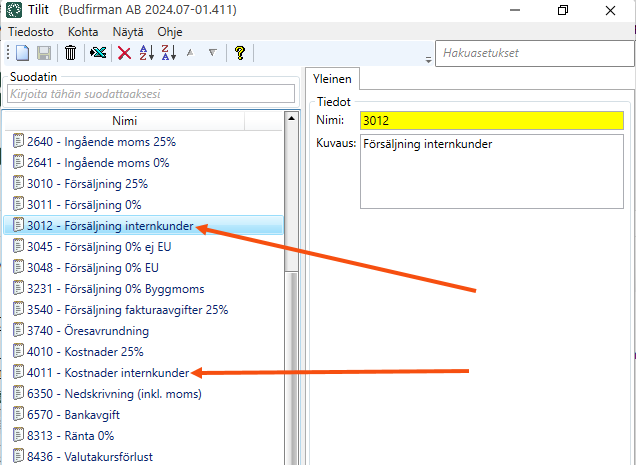 Valitse Hallinto > Tilit ja luo myynti- ja kustannustili, jolle voidaan tiliöidä sisäisiä laskuja.