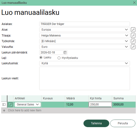 Napsauta Tiedosto > Manuaalinen lasku. Ikkuna Luo manuaalilasku avautuu.