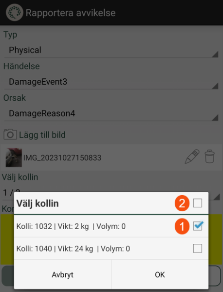 Jos kuljetus koostuu useasta kollista, voidaan myös määritellä, mitä kollia tai kolleja poikkeama koskee painamalla Valitse kolli(t)-painiketta. Esiasetettuna on kolli, jonka yksityiskohtanäkymä on avattu, kuten alla olevassa kuvassa (1).