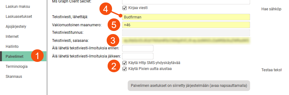 Valitse Käytä Http SMS-yhdyskäytävää ja Käytä Pixien uutta alustaa. Täytettävät kentät muuttuvat keltaisiksi.