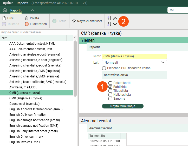 Raportit näkyvät valikossa samassa järjestyksessä kuin ikkunassa Raportit. Voit muuttaa järjestystä siirtämällä raportteja ylös ja alas (2).