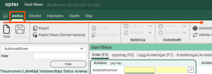 Voit käyttää Automaattinen -osoitetta hakeaksesi asiakkaiden nykyiset tilaukset etsimällä asiakaskoodin alkuosaa. Se toimii riippumatta siitä, koostuvatko asiakaskoodit numeroista vai kirjaimista. Jos haku kuitenkin täsmää johonkin muuhun kenttään, kyseinen järjestys näytetään sen sijaan. Esimerkiksi "opt" näyttää viimeisimmät tilaukset, joiden asiakaskoodi on "Opter".