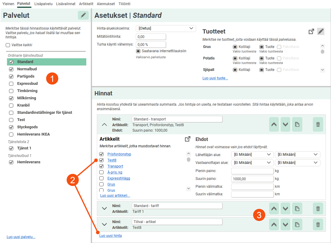 Artikkeli on rakennuspalikoita, joiden pohjalta tilauksen hinnat muodostuvat. Artikkeli on yksilöllinen kussakin hinnastossa. Vaikka niillä on sama nimi, niiden asetukset ja hinnoittelu voivat vaihdella eri hinnastoissa. Sinun on siis oltava oikeassa hinnastossa, kun luot Artikkeli. Artikkeliin avulla hinnoittelet palvelut, jotka antavat tilaukselle sen hinnan. Ne voidaan lisätä myös manuaalisesti tilauksen tuoteriveille.