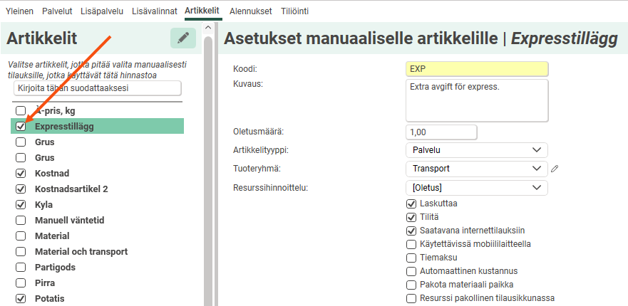 Valitse hinnaston Artikkelit -välilehdeltä ne artikkelit, jotka voidaan lisätä tilaukseen manuaalisesti rastittamalla ne luettelosta. Tämän jälkeen artikkeli voidaan lisätä tilausten vastaanottokohderiveille. Jos haluat, että ne ovat käytettävissä myös verkkoportaaleissa ja Opter Driverissa, valitse Saatavana internettilauksiin ja Käytettävissä mobiililaitteella.