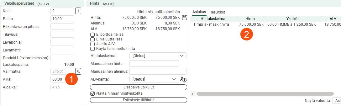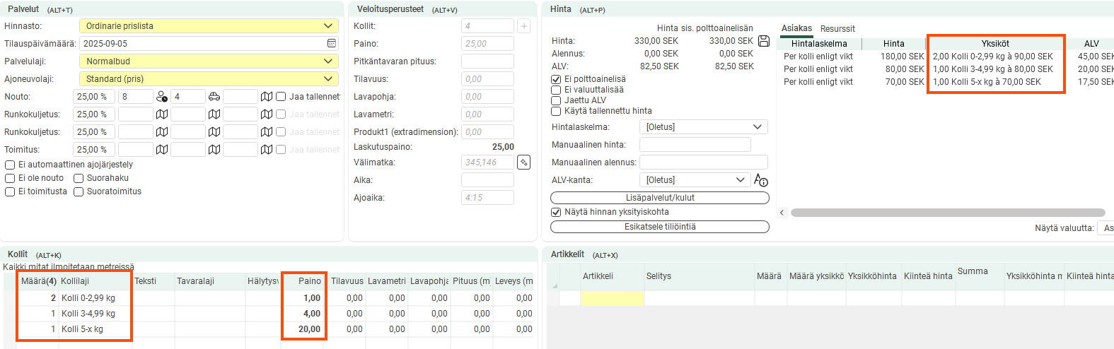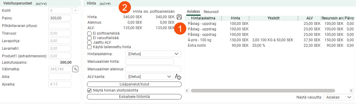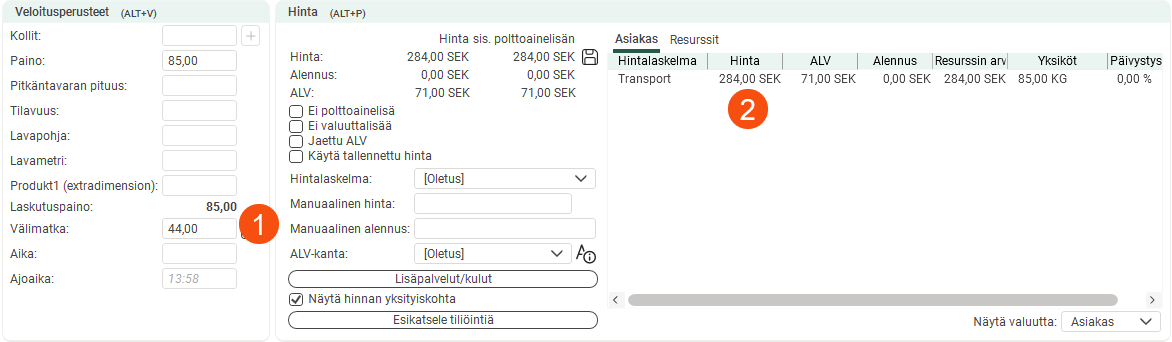 Alla olevassa esimerkissä tilauksen hinnoittelupaino on 85 kg ja etäisyys 44 km (1). Matriisin välit ovat "alkaen ja mukaan lukien", joten hinta on 284 kruunua (leikkaus 80-99,9 kg ja 20-59,9 km), joka on kerätty tilauksesta (2).