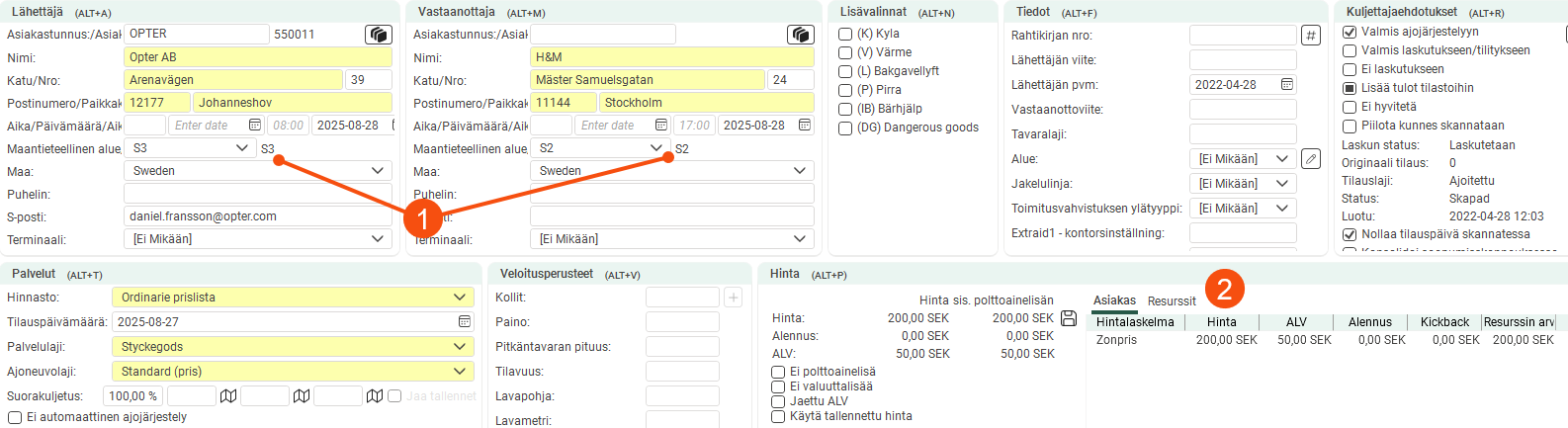 Alla olevassa esimerkissä toimeksianto siirtyy hinta-alueelta S3 hinta-alueelle S2 (1), jolloin hinta on 200 kruunua (2).