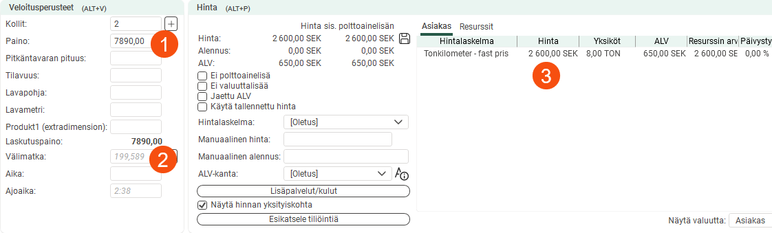 Alla olevan tilauksen paino on 7,89 tonnia (1), ja matka on vajaat 200 kilometriä (2). Hinta on 2 600 kruunua (3).