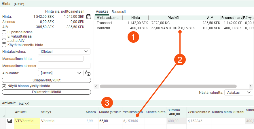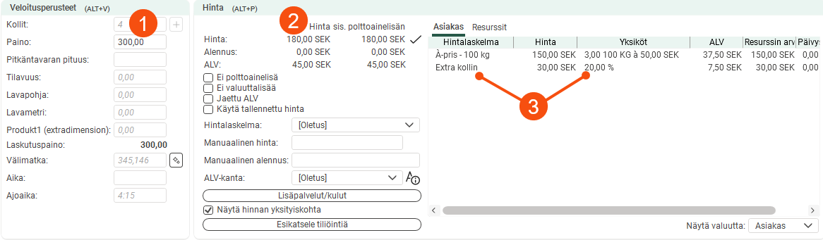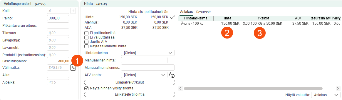 Alla olevan tilauksen hinnoittelupaino on 300 kg (1). Hinta on 3 × 50 = 150 kruunua (2). Osoitteessa Yksiköt näet hinnan perustana olevien yksiköiden määrän (3).