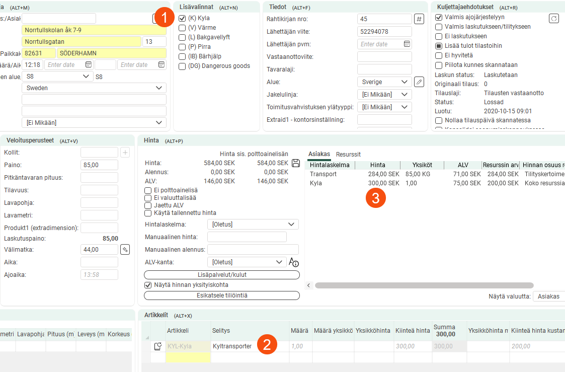 Kun lisävalinnat valitaan tilauksessa (1), artikkeli lisätään artikkeli-riviin (2) ja lasketaan yhteen muiden hintaperusteisten artikkeleiden (3) kanssa, tässä tapauksessa hinnoittelupainossa olevan artikkeliin "Kuljetus" liittyvä artikkeli.
