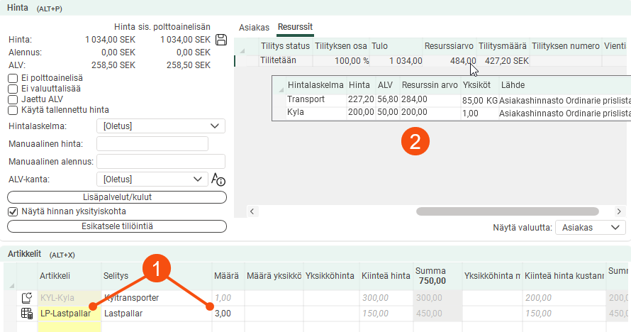 Alla olevaan tilaukseen olemme lisänneet lisämyyntinä kolme kuormalavaa, joiden yhteismäärä on 450 kruunua (1). Jos tarkastelemme välilehteä Resurssit, huomaamme , että tämä summa ei sisälly resurssiarvoon, johon tilitys perustuu (2).