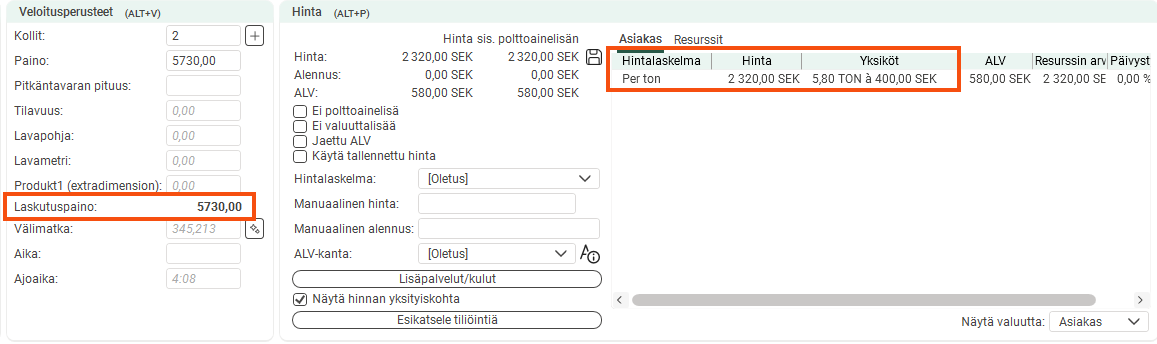 Tämän tilauksen hinnoittelupaino on 5,73 tonnia, joten yksikköhinta on 5,8 × 400 = 2 320 kruunua, kun paino pyöristetään.