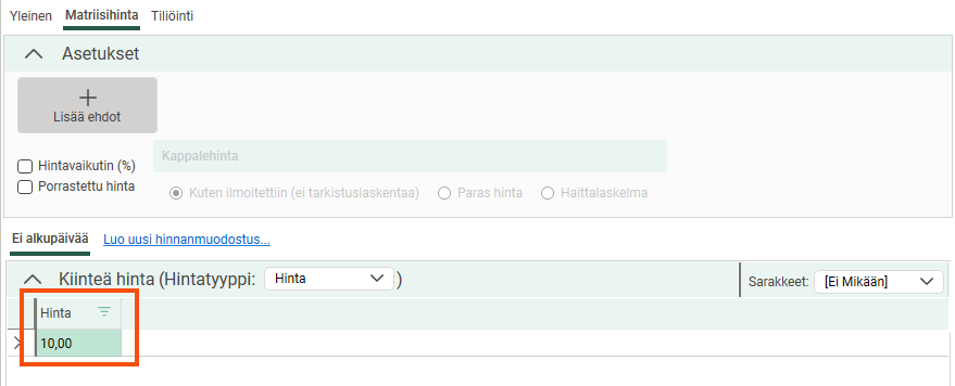 Hintamatriisi on yksinkertainen. Kirjoita hinta ensimmäiseen soluun osoitteessa Kiinteä hinta. Mitään ehtoja ei tarvita.