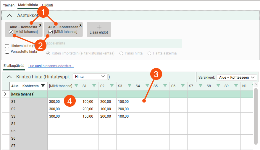 Jos et halua täyttää hintoja kaikille vyöhykeyhdistelmille tai jos hinta on sama useille vyöhykeyhdistelmille, voit valita [Mikä tahansa] (2) ja täyttää hinnan sille matriisiin. Jos toimeksiannolle annetaan vyöhykeyhdistelmä, jolla ei ole hintaa, esimerkiksi S1-S4 alla olevassa esimerkissä (3), käytetään sen sijaan S1-[Mikä tahansa] hintaa (4). Se toimii siis eräänlaisena perushintana, joka kattaa kaiken.