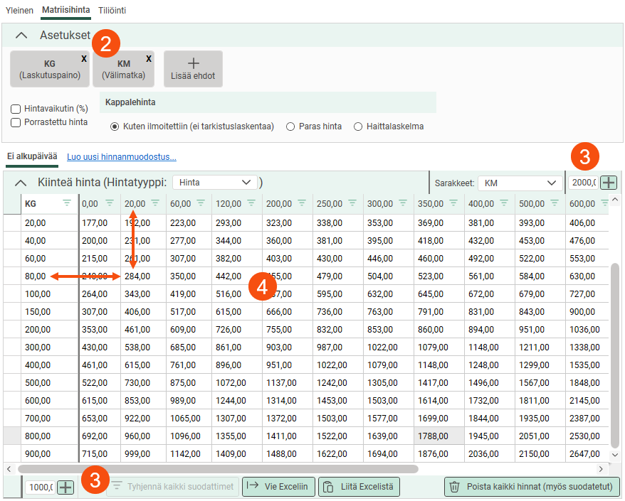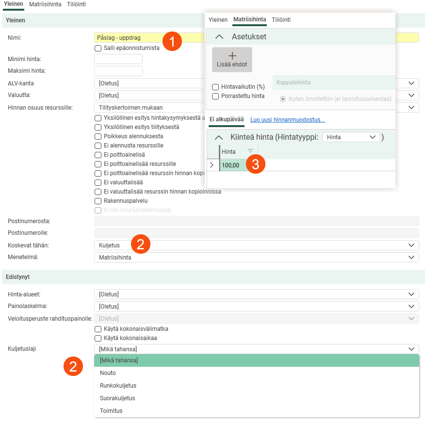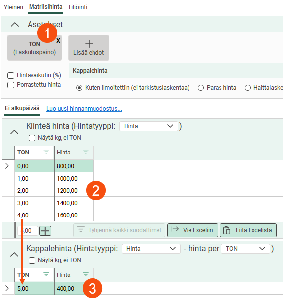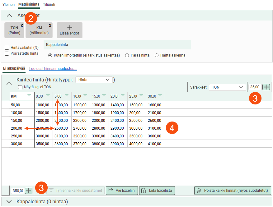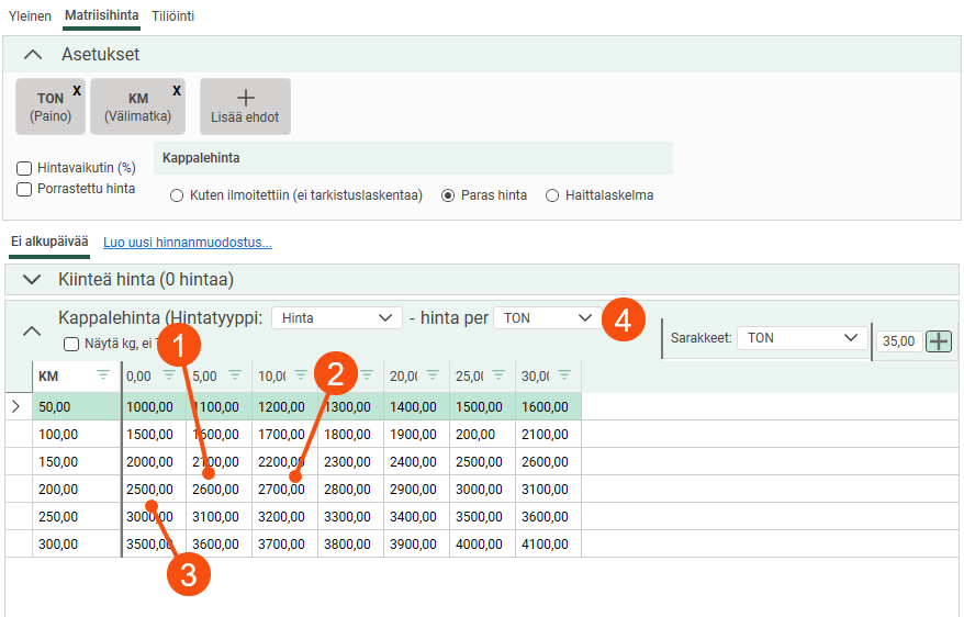 Lisää hintamatriisiin termit "tonni" ja "kilometri". Suluissa näet, mikä tilauksen ulottuvuus on hintaperuste.
