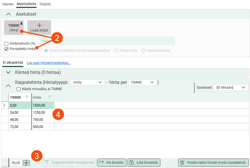 Tässä tapauksessa haluamme laskea tuntihinnan, mutta myös alemman tuntihinnan toisesta, kolmannesta ja neljännestä päivästä alkaen. Eräänlaisena alennuksena pitkäaikaisesta vuokrauksesta. Ratkaisuna on kappalehinta (yksikköhinta) ja porrastettu hinnoittelu (ks. Vaiheittainen hinta ja haittalaskelma).