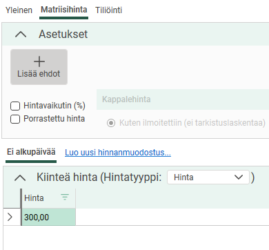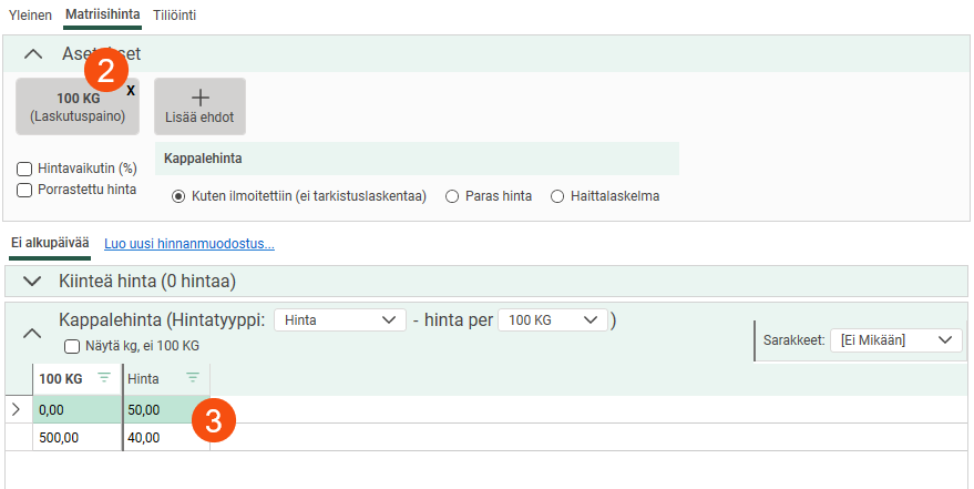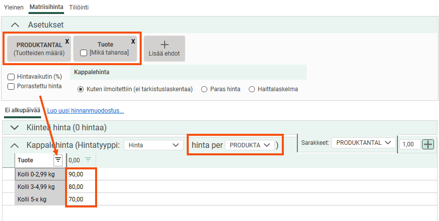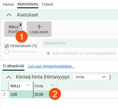 Lisää ehdot hintamatriisiin. Suluissa näet, mikä tilauksen ulottuvuus on hintaperuste.