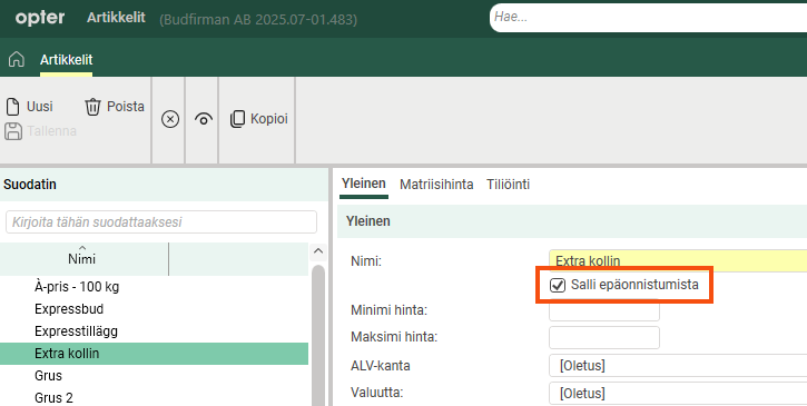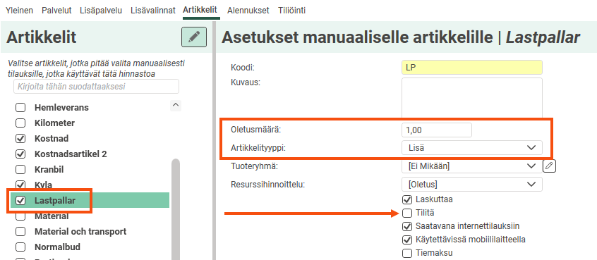 Rastita Artikkeli hinnaston Artikkelit -välilehdellä olevassa luettelossa. Valitse artikkelityyppiksi Lisä ja poista valinta Tilitä. Olemme myös täyttäneet "1" oletusnumeroksi. Numero voidaan muuttaa tilauksen nimikerivillä.