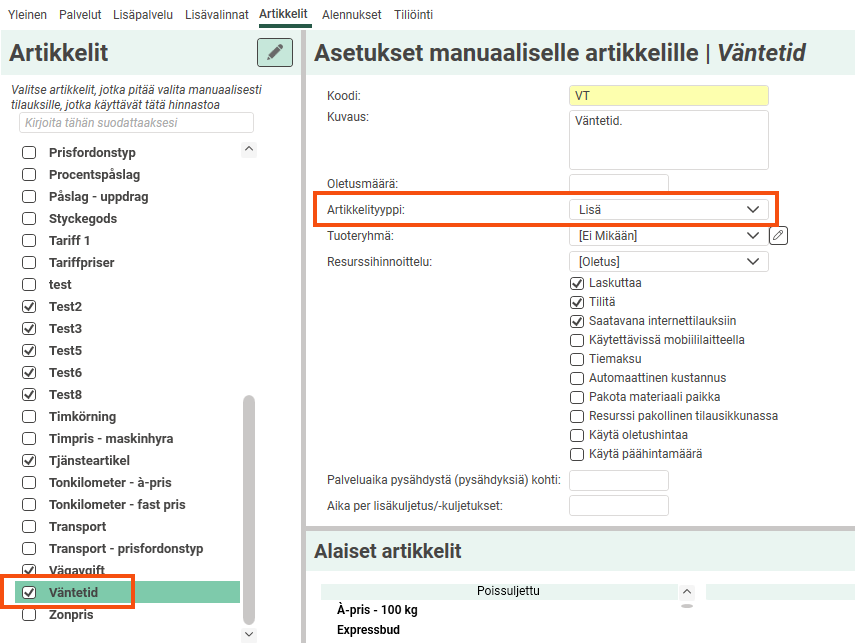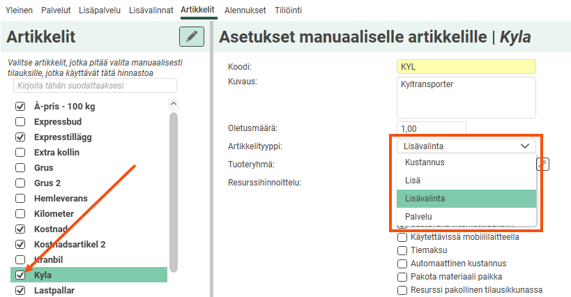 Rastita nimike hinnastossa niin, että se toimii manuaalisena nimikkeenä, ja valitse artikkelityyppi Lisä.