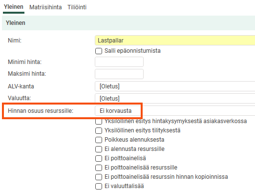 Siirry Yleinen -välilehdelle ja valitse Ei korvausta avattavasta valikosta Hinnan osuus resurssille.