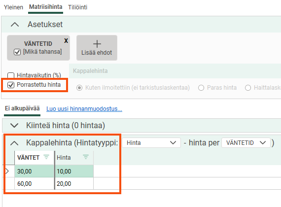 Merkitse Porrastettu hinta ja laita hinnat osoitteeseen Kappalehinta, koska haluamme, että 30-60 minuutin odotusaika maksaa 10 kruunua minuutissa ja 60 minuutista alkaen 20 kruunua minuutissa.