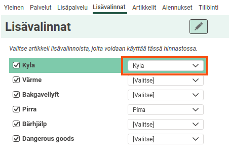 Siirry hinnastossa välilehdelle Lisävalinnat ja valitse "Jäähdytys"-lisävalinnat Artikkeli.
