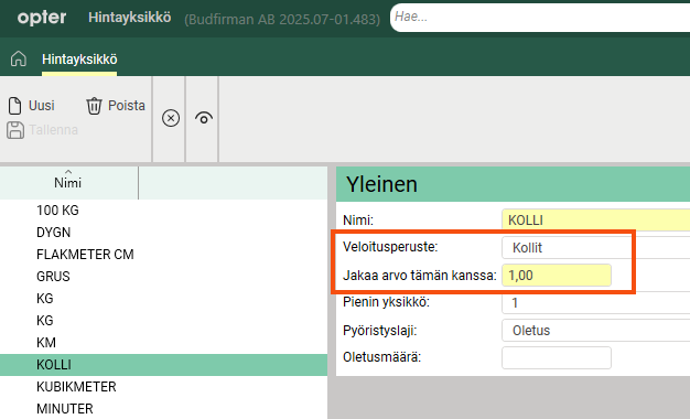 Lisää hintayksiköt "KG" (painon tai hinnoittelupainon perusteella) ja "KM" (etäisyyden perusteella), jos niitä ei vielä ole. Lisätietoa asetuksista on kohdassa Hintayksikkö (ikkuna).